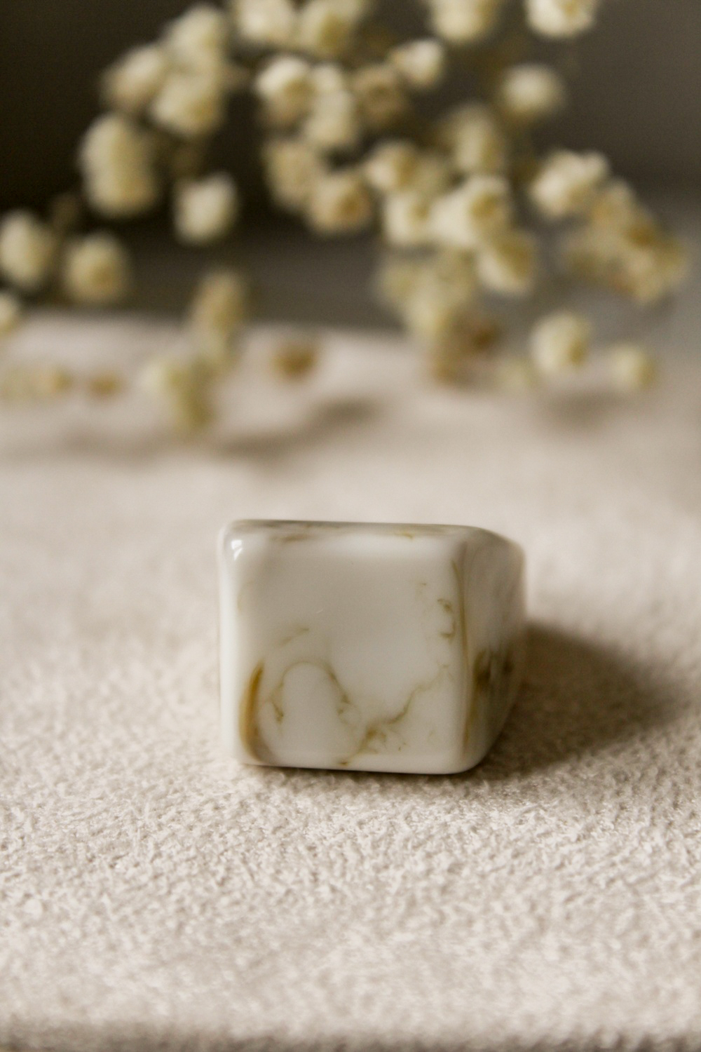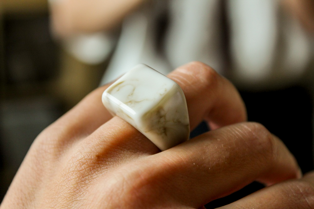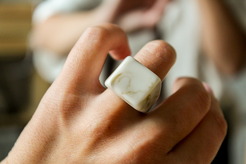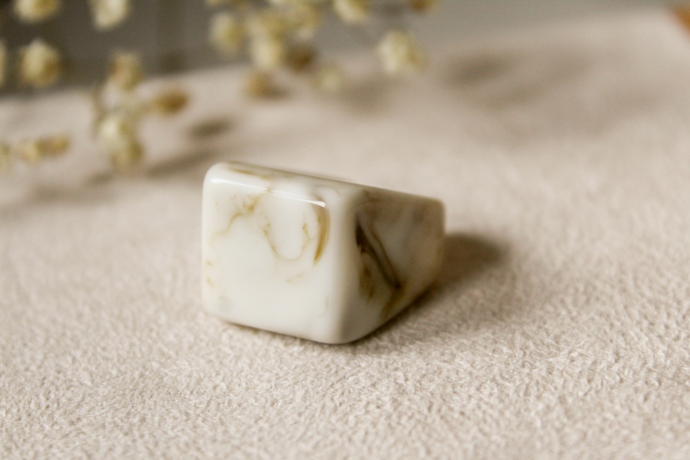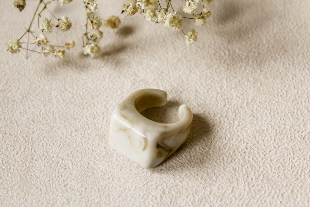 Duży pierścionek z żywicy epoksydowej w kolorach beżu i brązu.