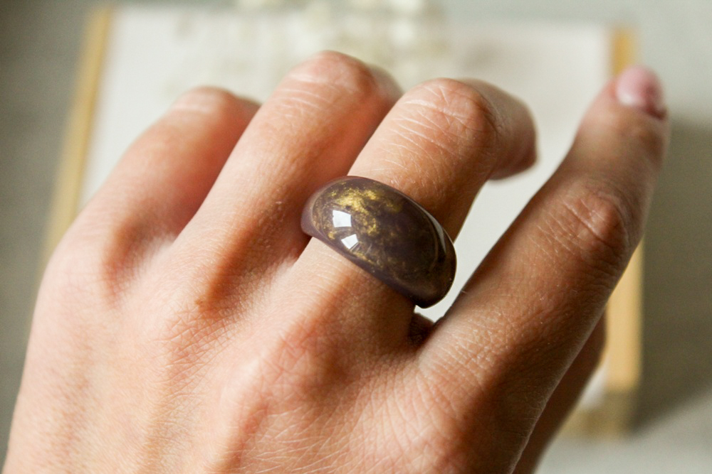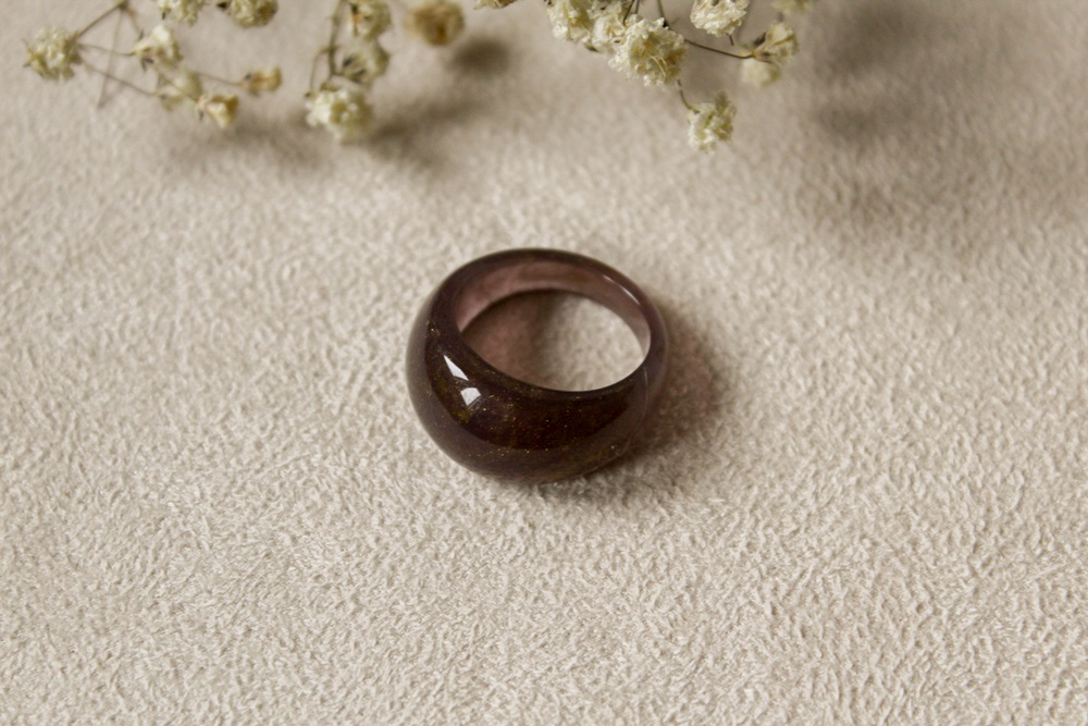 Duży pierścionek z żywicy epoksydowej w kolorze brązowo złotym.