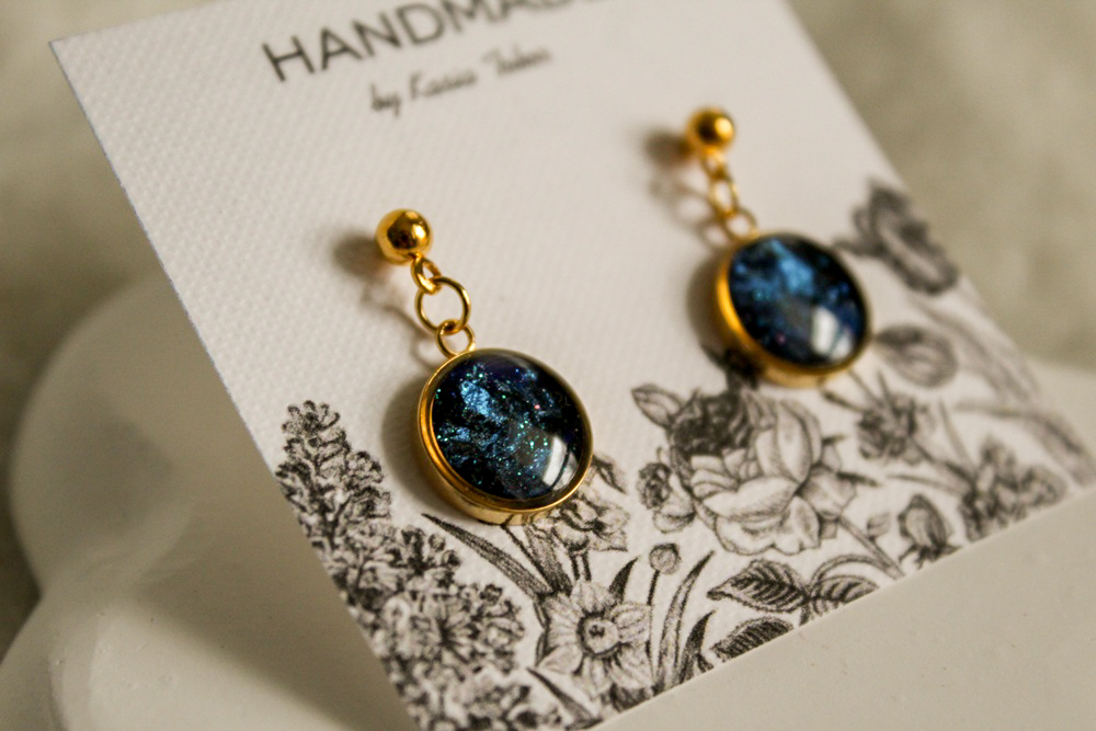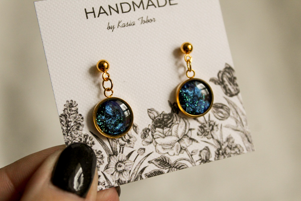 Delikatne kolczyki galaktyczne stworzone na bazie ze stali chirurgicznej w kolorze złota z ręcznie malowanym oczkiem w odcieniach niebieskiego, granatu oraz zieleni. Zatopiłam również szczyptę brokatu, co nadaje całości galaktycznego, tajemniczego klimatu.