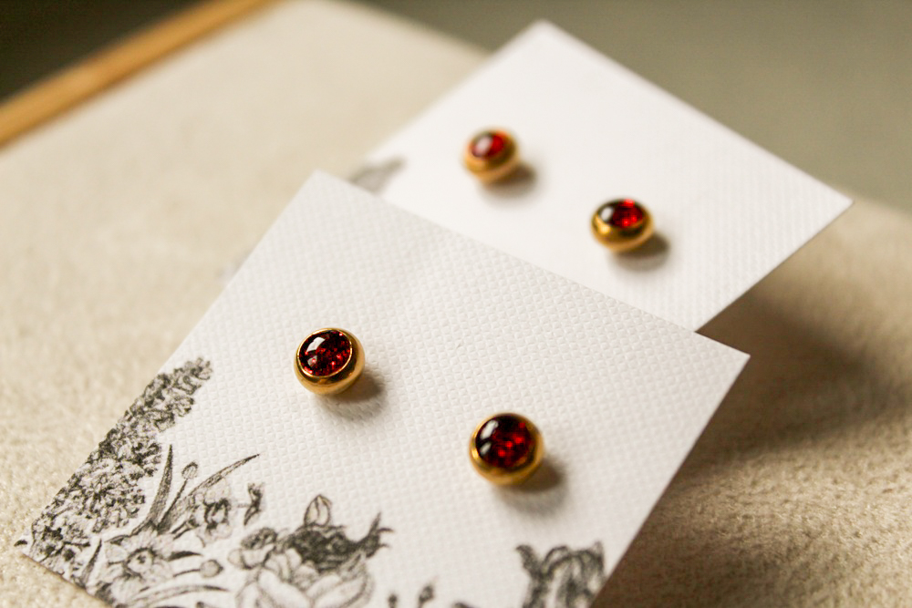Drobne kolczyki na bazie ze stali chirurgicznej w kolorze złotym. Oczko mocno brokatowe, czerwone zalane żywicą jubilerską oraz brokatem.