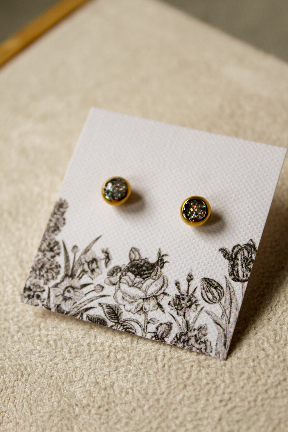 Drobne kolczyki na bazie ze stali chirurgicznej w kolorze złotym. Oczko mocno brokatowe, srebrne zalane żywicą jubilerską oraz brokatem.