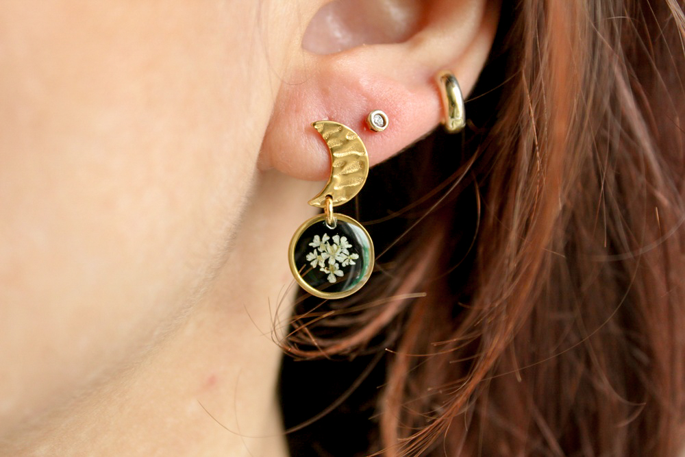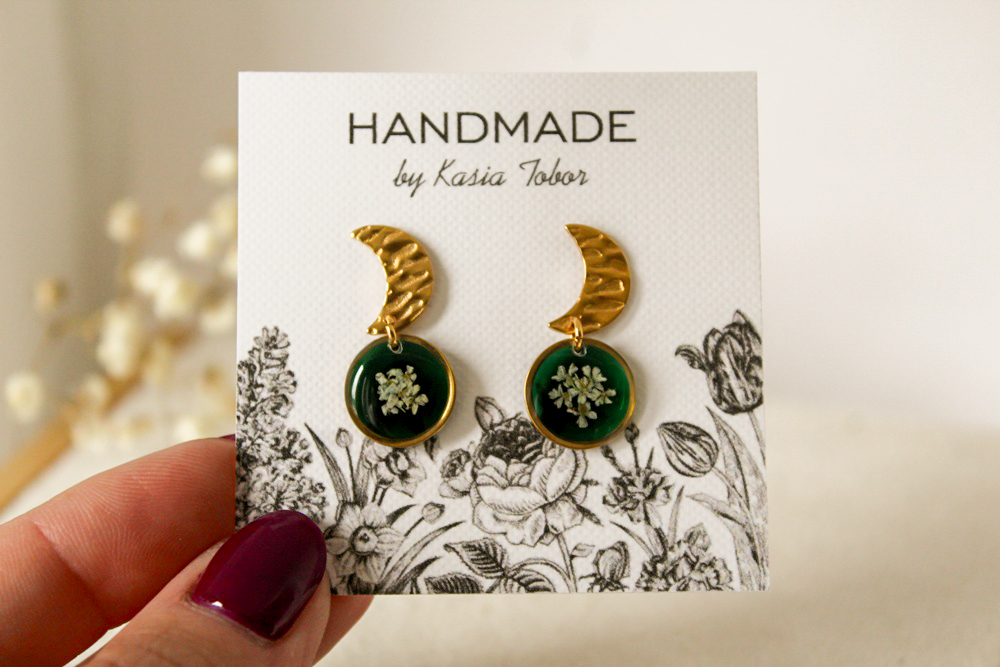 Kolczyki księżycowe ze stali chirurgicznej w kolorze złotym z oczkiem szmaragdowym z zatopionymi kwiatami dzikiej marchwi.