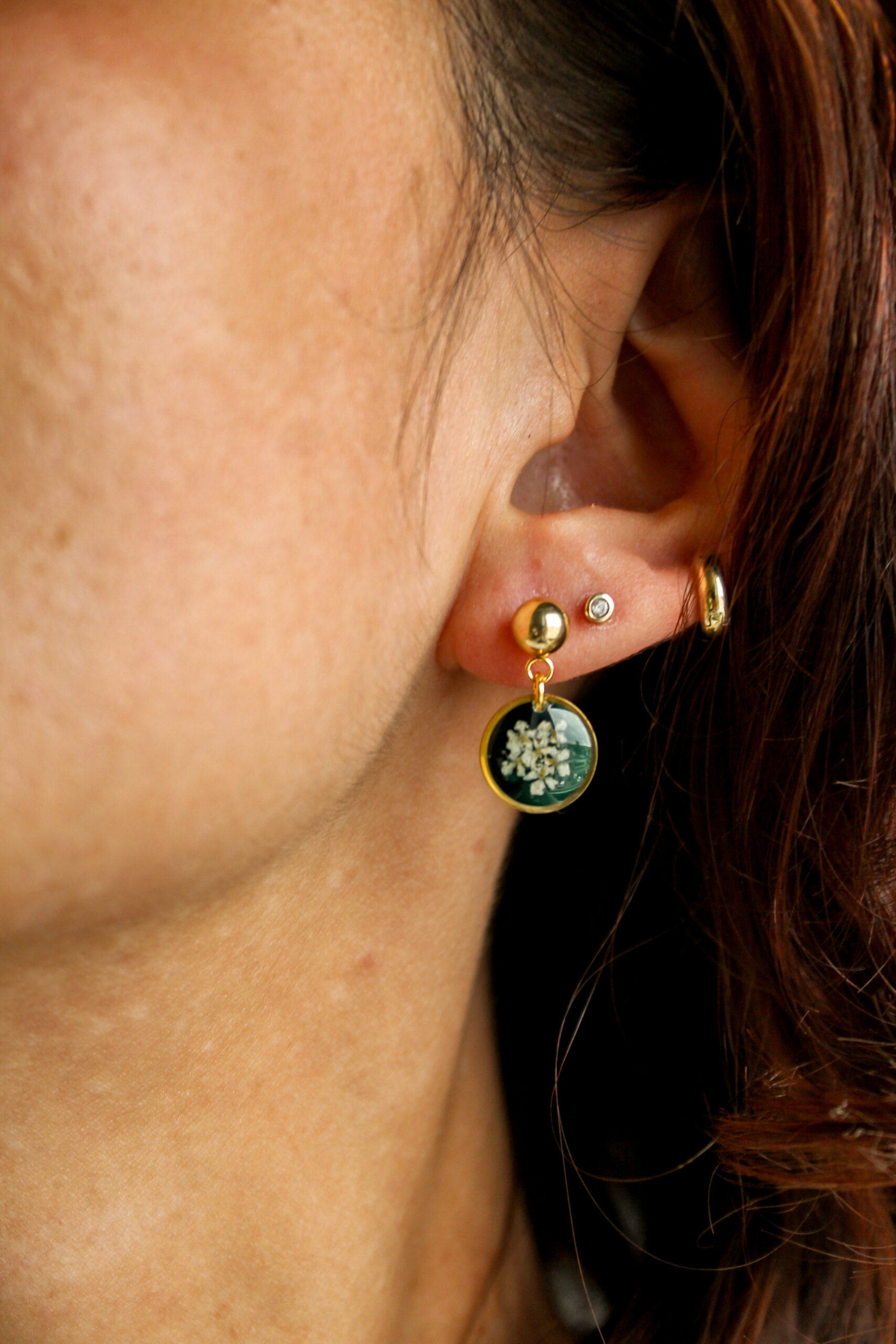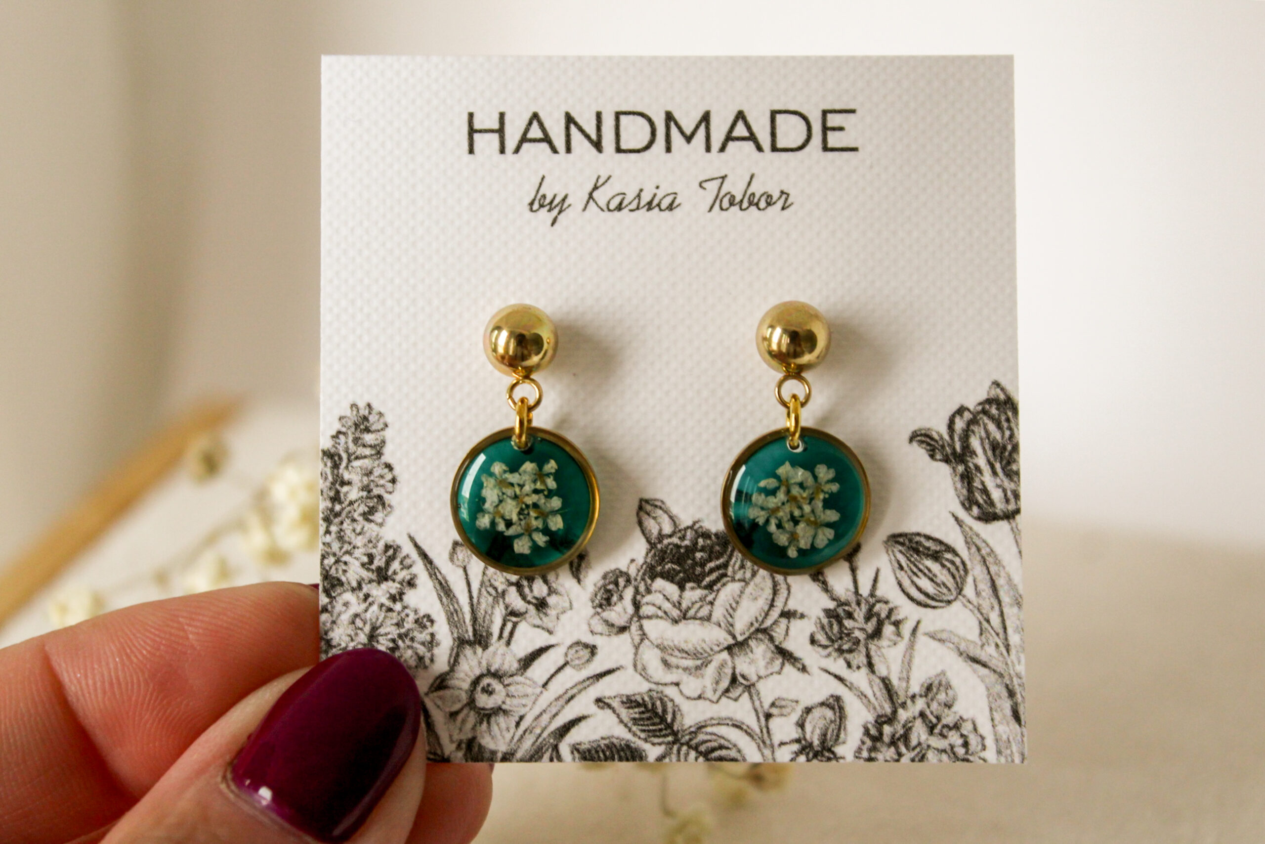 Kolczyki na bazie kuleczki ze stali chirurgicznej z oczkiem okrągłym wiszącym, w którym zatopiłam na szmaragdowym tle kwiaty dzikiej marchwi.
