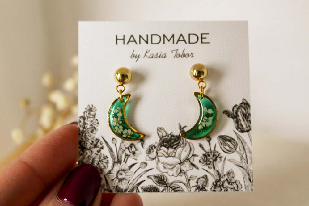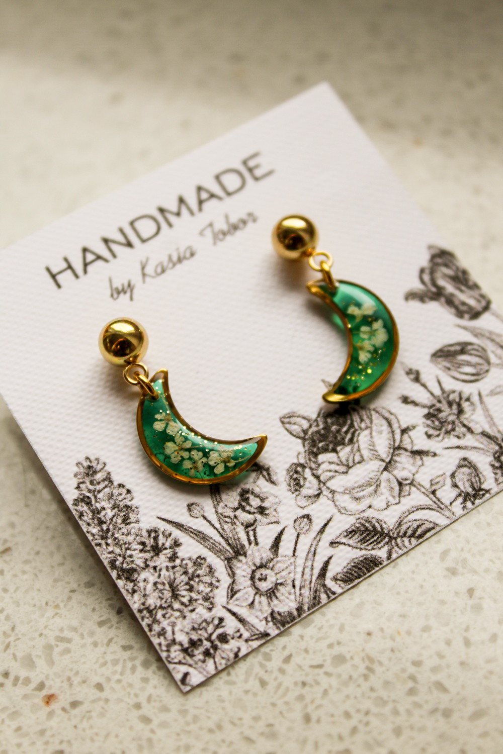 Kolczyki na bazie księżycy ze stali chirurgicznej z oczkiem wiszącym, w którym zatopiłam na zielonym tle kwiaty dzikiej marchwi.