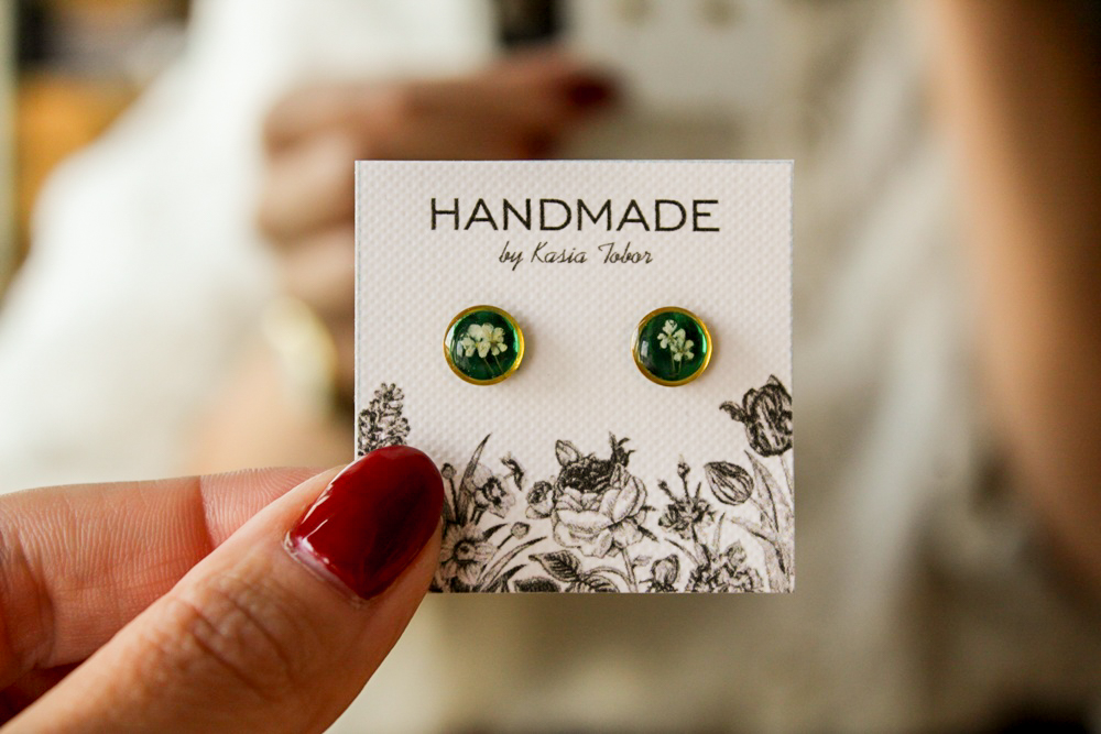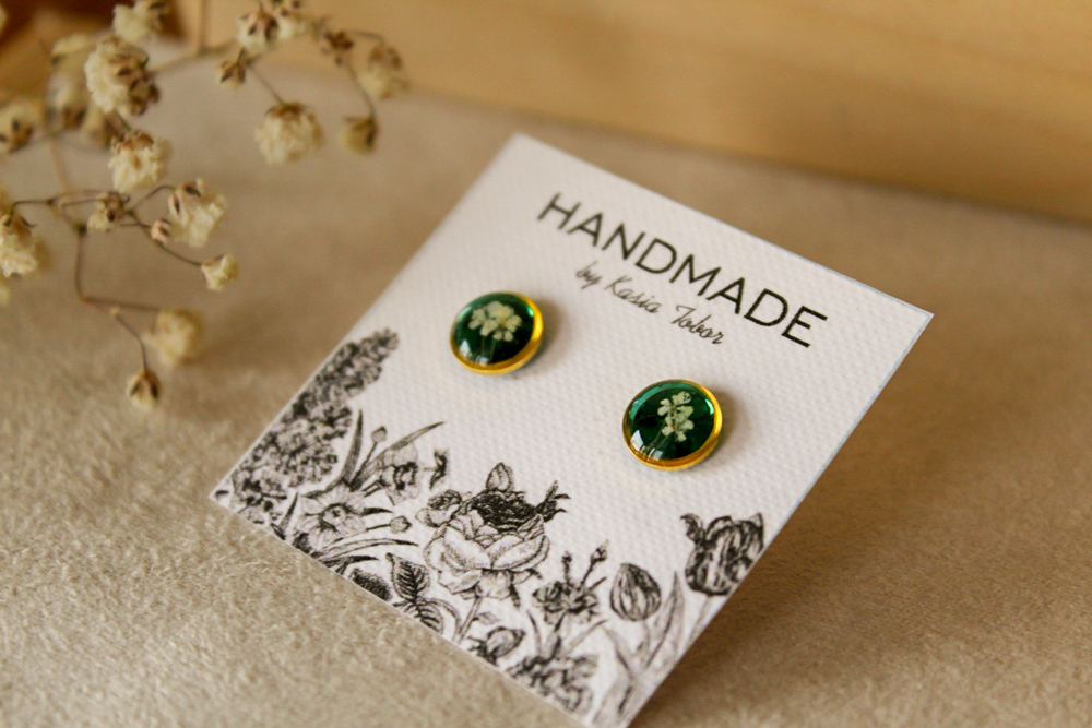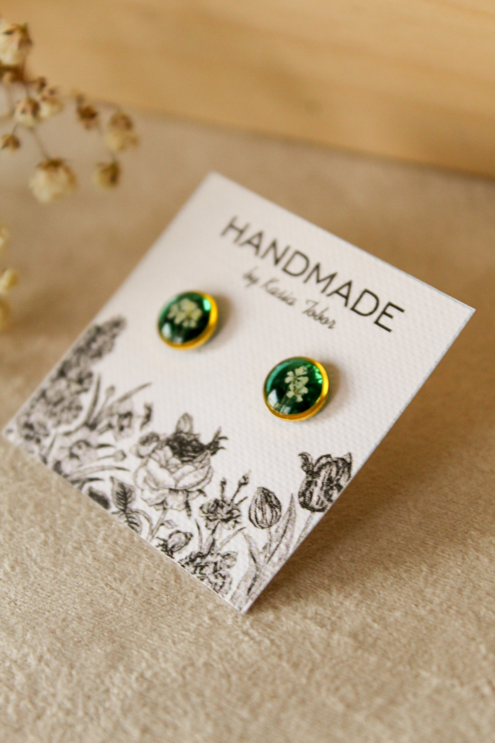 Kolczyki wkrętki ze stali chirurgicznej w kolorze złotym z oczkiem szmaragdowym z zatopionym kwiatem dzikiej marchwi.