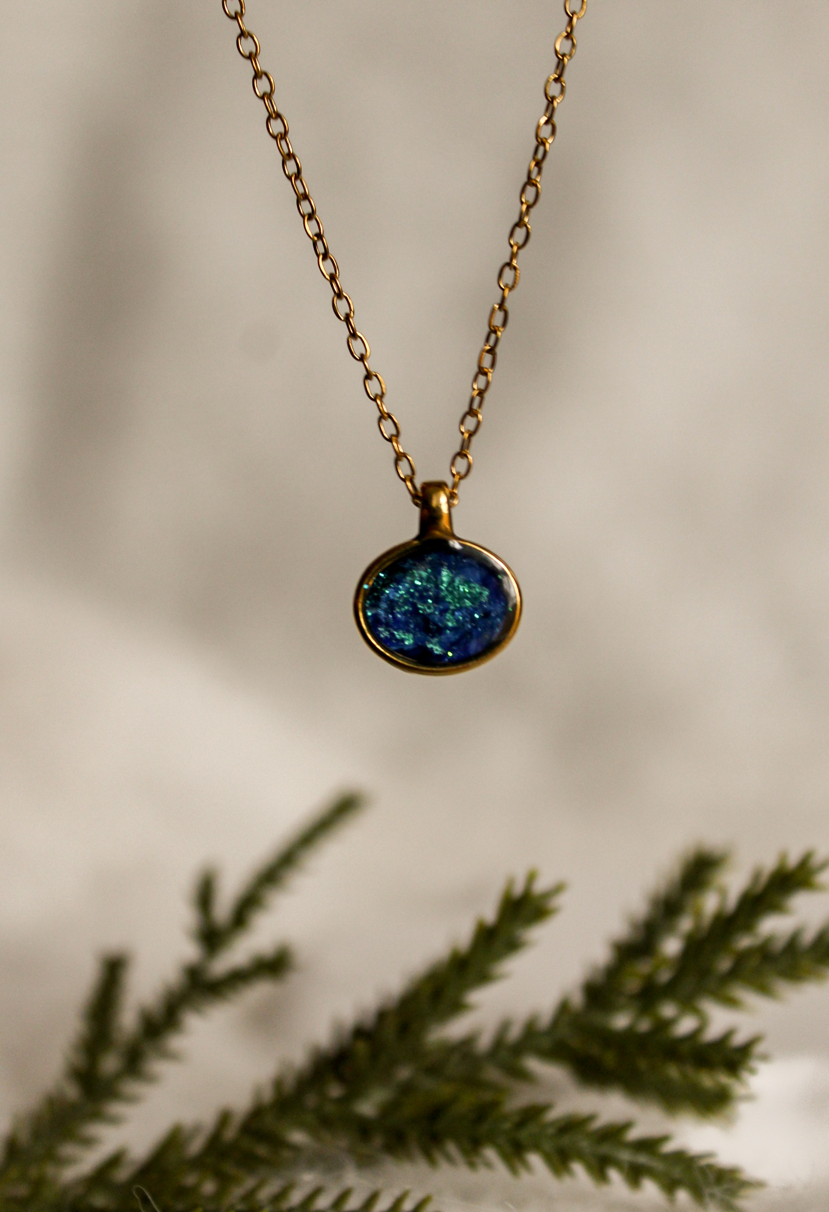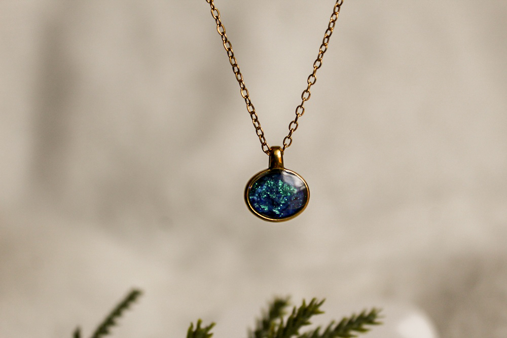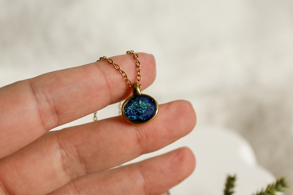 Medalik galaktyczny stworzony na bazie ze stali chirurgicznej w kolorze złota z ręcznie malowanym oczkiem w odcieniach niebieskiego, granatu oraz zieleni. Zatopiłam również szczyptę brokatu, co nadaje całości galaktycznego, tajemniczego klimatu.
