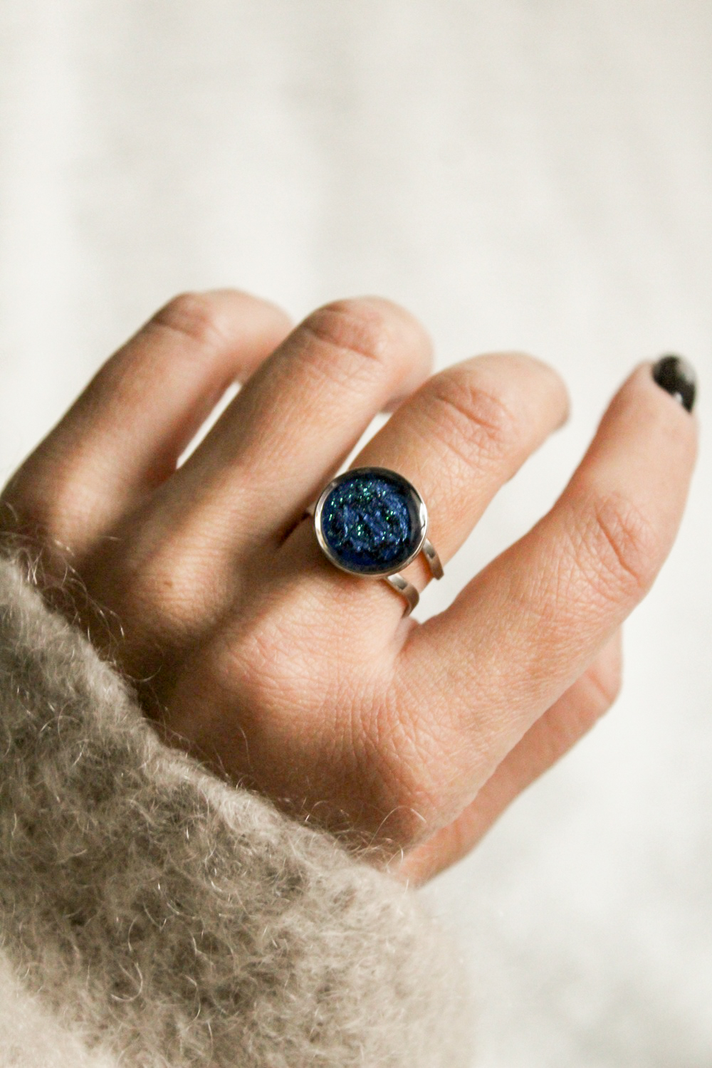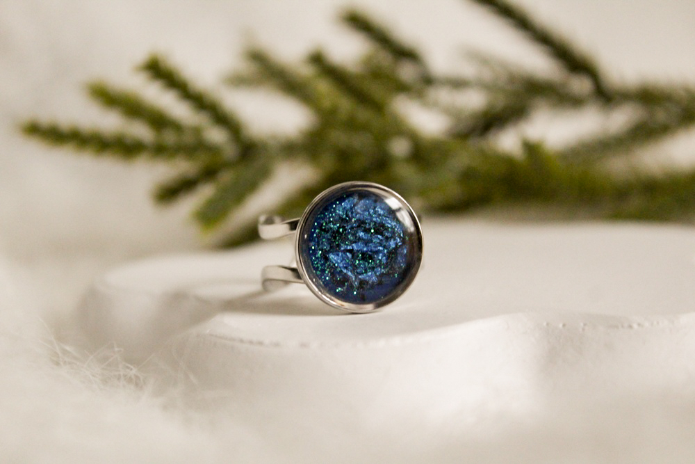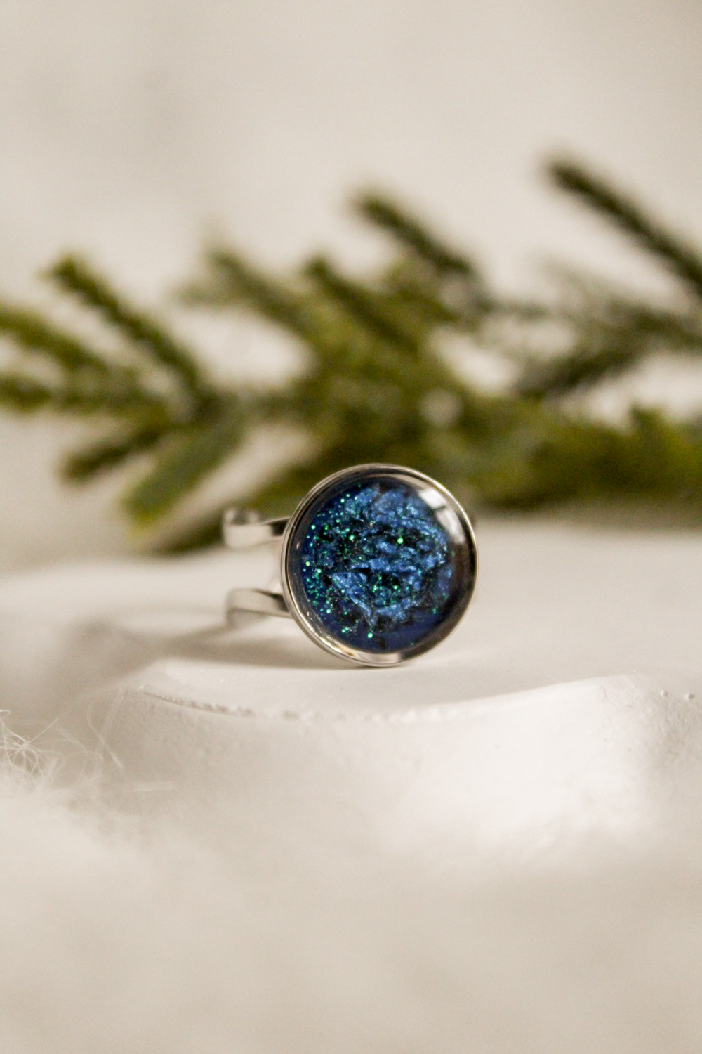 Oryginalny pierścionek ze stali chirurgicznej w kolorze srebrnym. Oczko ręcznie malowane farbami akrylowymi w odcieniach niebieskiego, granatu oraz zieleni, dodatkowo błyszczy szczypta brokatu.