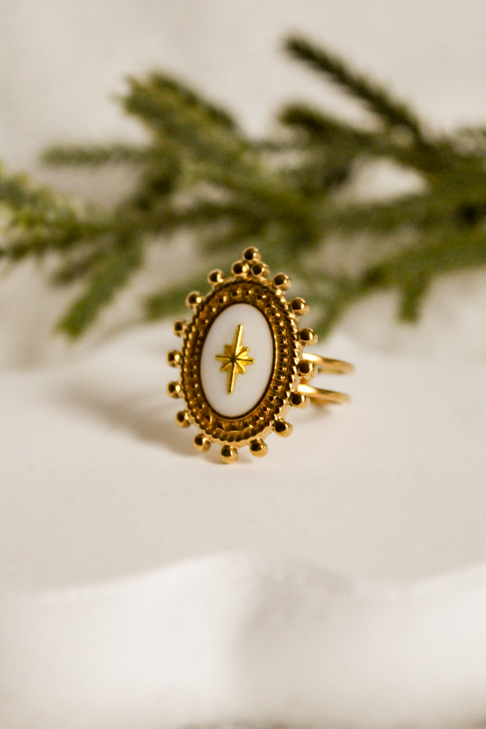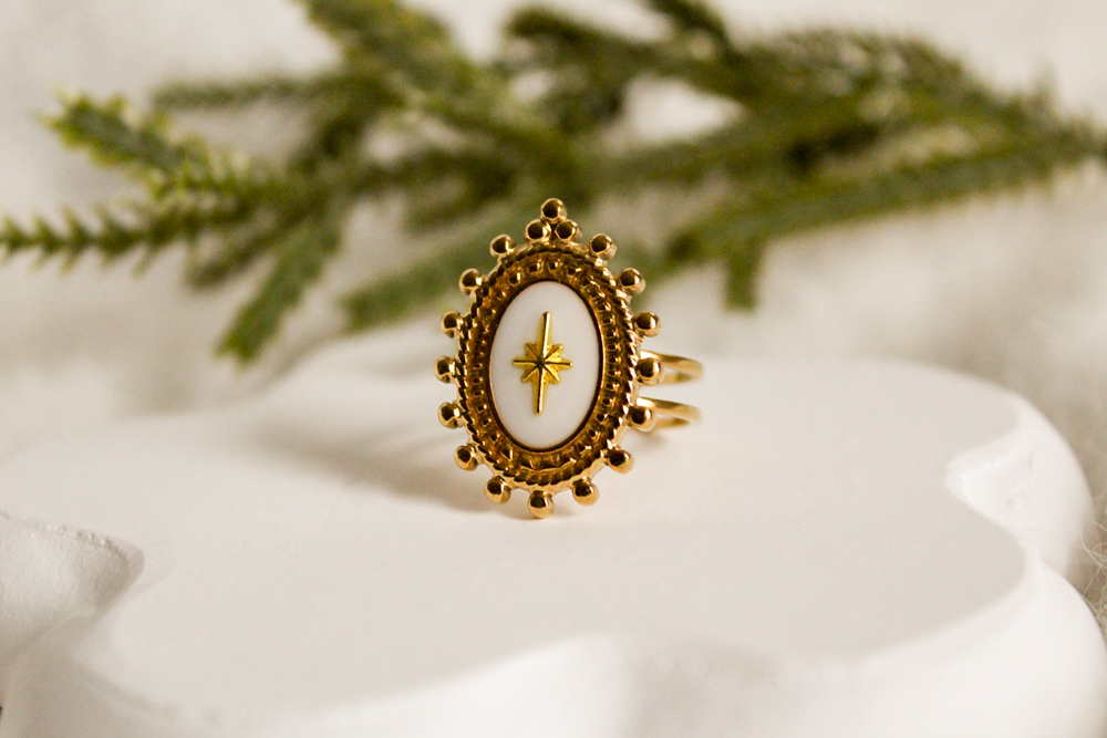 Oryginalny pierścionek ze stali chirurgicznej w kolorze złotym. Oczko białe z zatopioną gwiazdą.