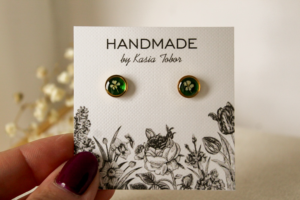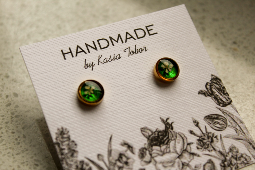 Kolczyki wkrętki ze stali chirurgicznej w kolorze złotym z oczkiem zielonym z zatopionym kwiatem dzikiej marchwi.